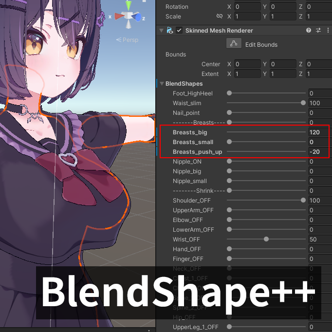 문서BlendShape++개요 BlendShape++는 블렌드 셰이프 값을 0 미만 또는 100 초과로 확장해 설정할 수 있도록 돕는 도구입니다. 기존 블렌드 셰이프 조작 방식 그대로 사용할 수 있어 별도의 복잡한 워크플로우 없이 적용할 수 있습니다. 업로드 시에는 VRChat에서 사용할 수 있는 형태로 자동 변환되며, FX 레이어 애니메이션도 지원합니다.Last updated on 2026년 3월 2일업데이트 로그설치
